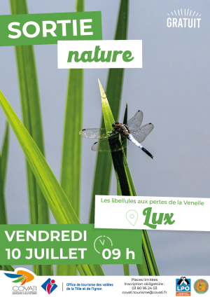 Venez découvrir les libellules aux pertes de la Venelle, à Lux, avec un parcours de 3km aller-retour. Durée : 1h30.